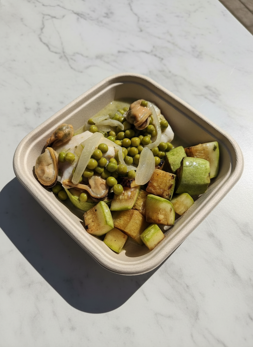 guisantes, MEJILLONES, merluza, perejil, RASPAS DE